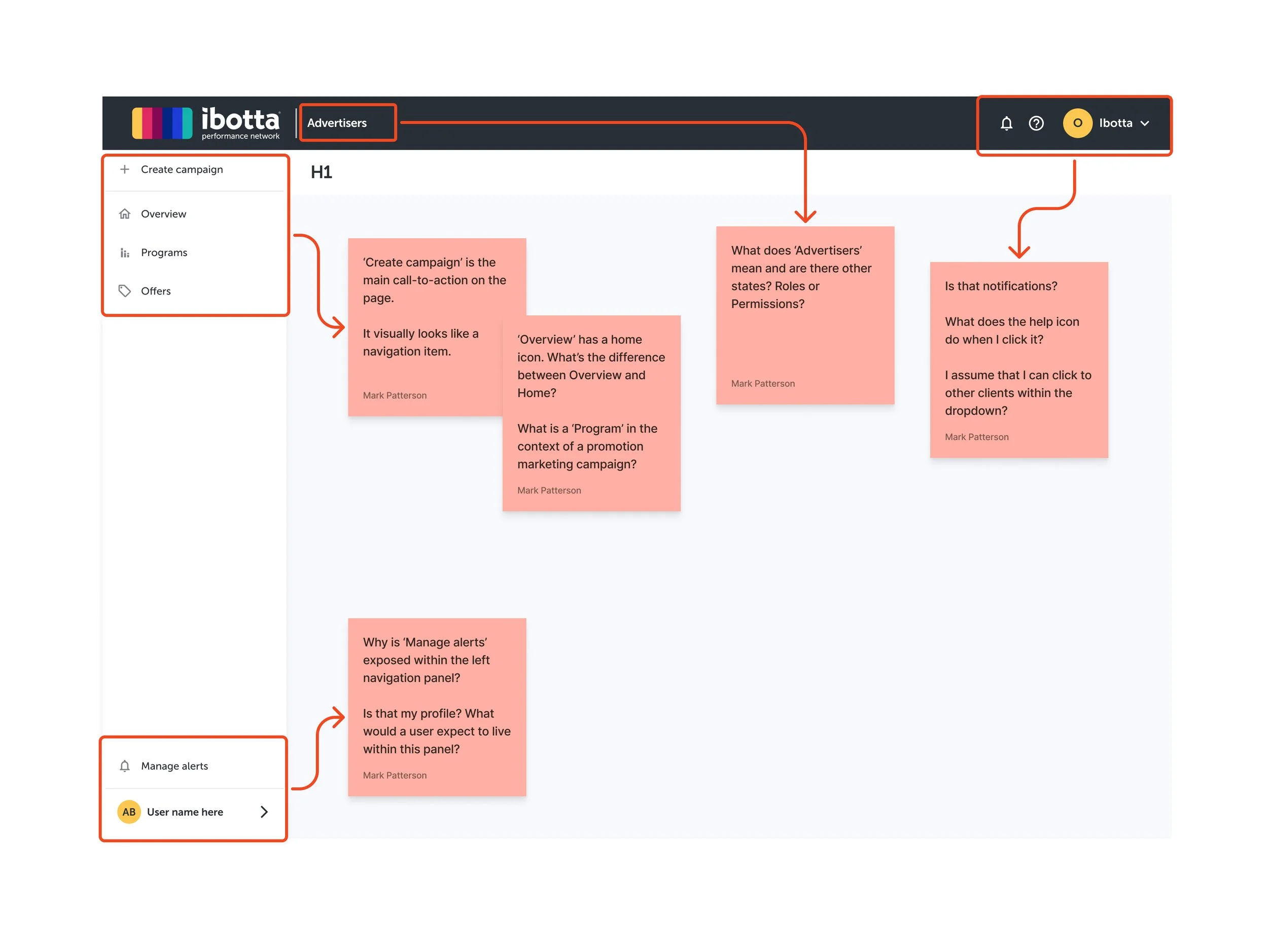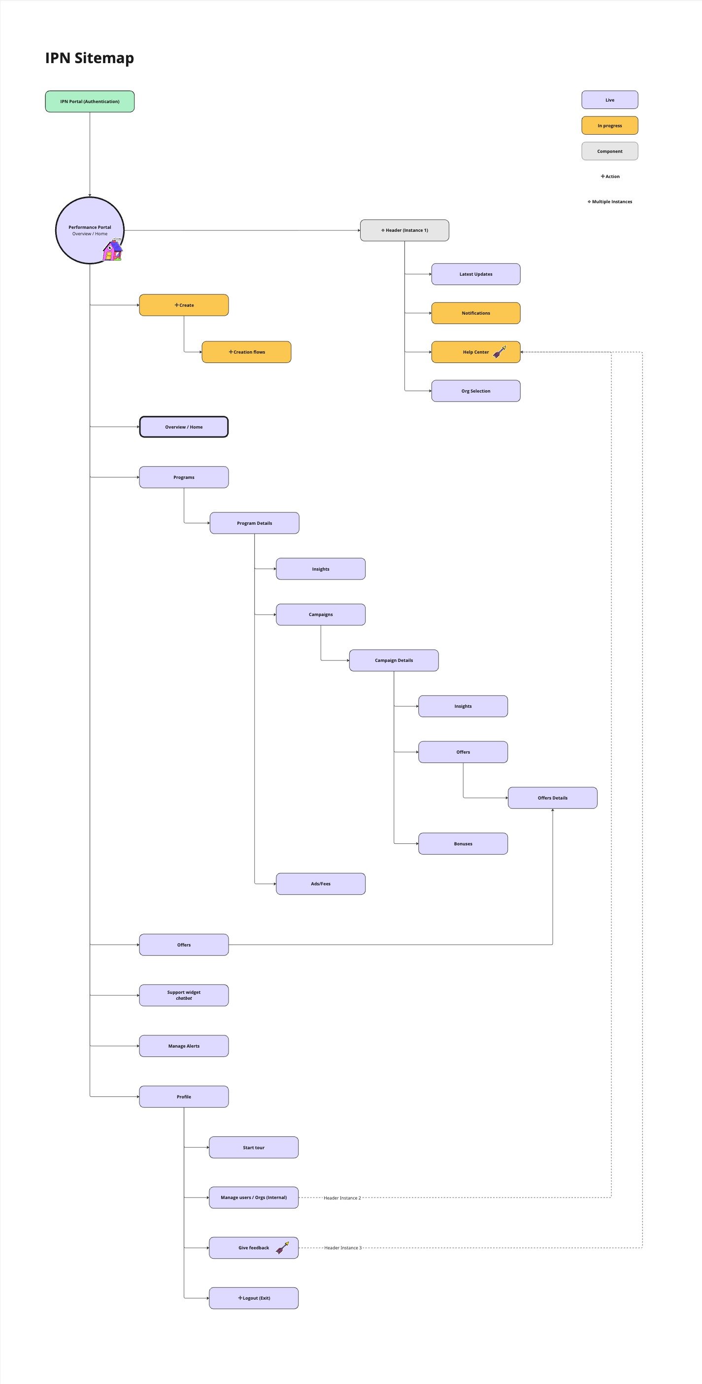 Annotated navigation screens and an external sitemap surfaced systemic friction between user intent and platform structure. Overloaded navigation items mixed actions with destinations, terminology like “Programs” lacked clarity, global and local navigation patterns were duplicated, and account context (e.g., organization state, alerts, profile access) was ambiguous—revealing accumulated structural debt and reinforcing the need for a validated, lifecycle-driven IA before scaling further.